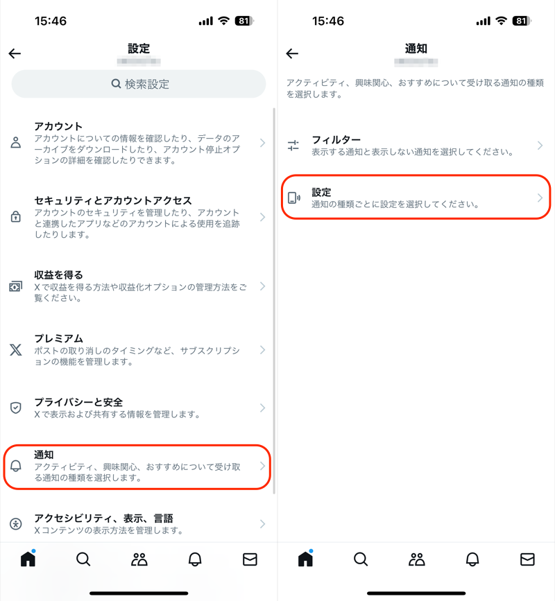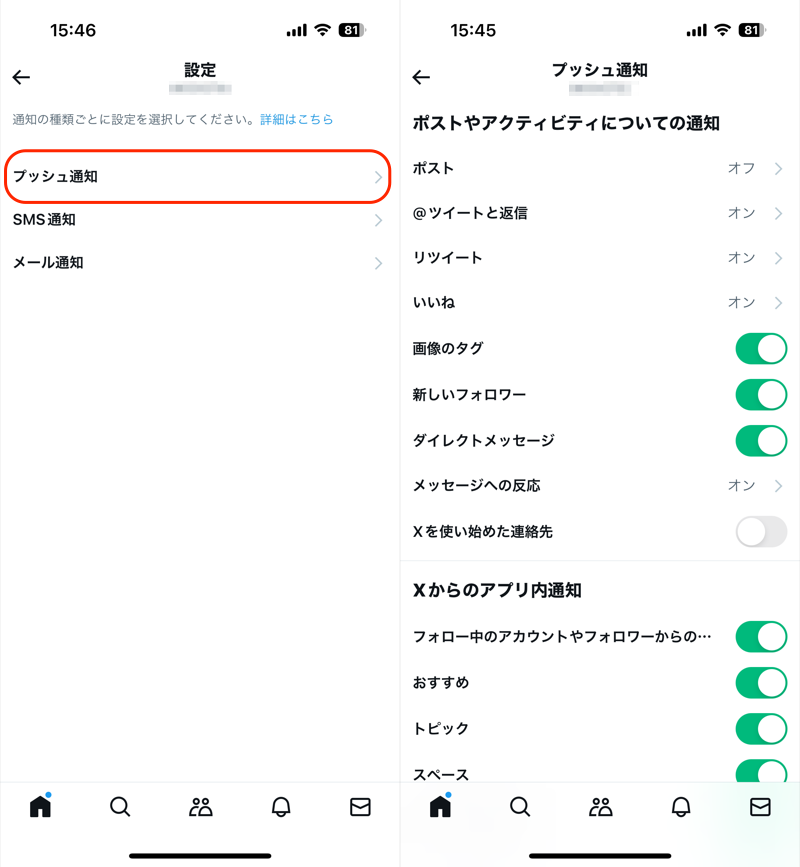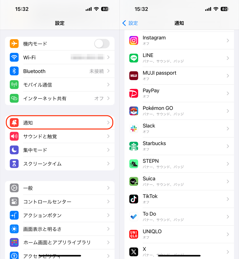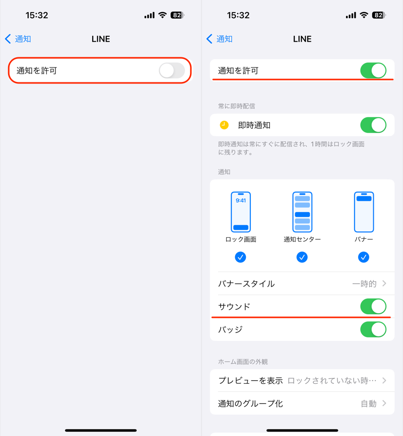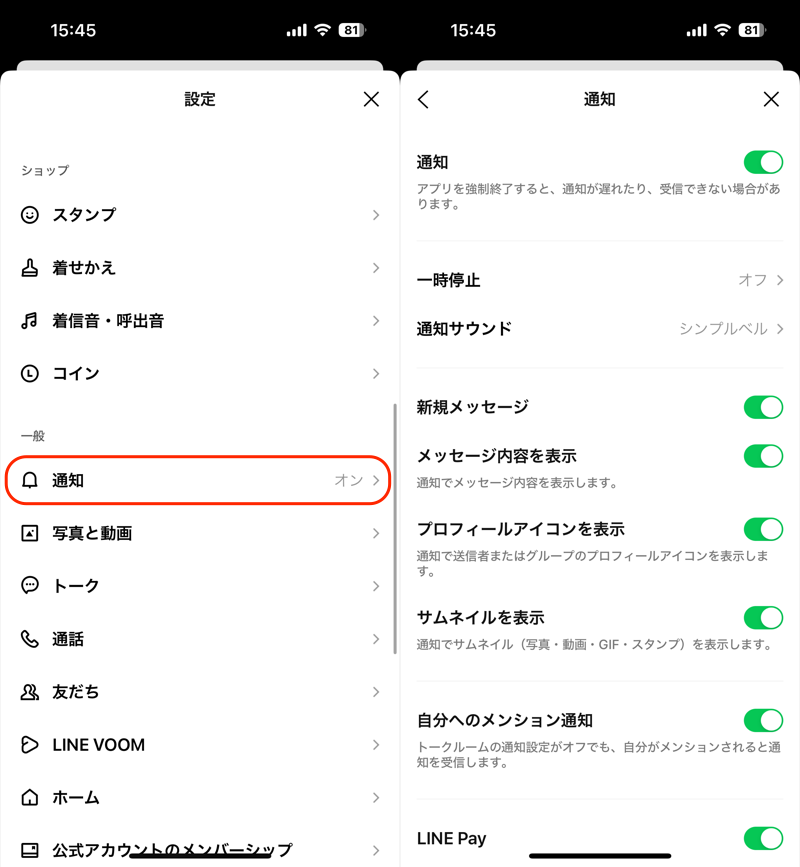 (左)LINE 应用程序设置 → 通知(右)显示通知类型