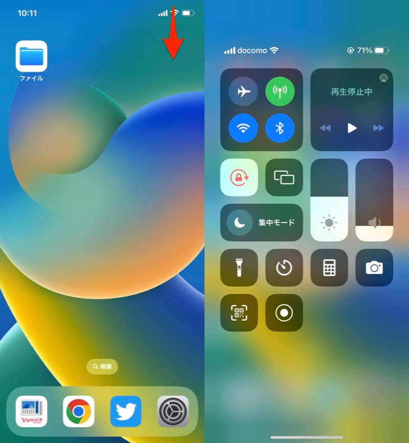 (左)向下滑动红色箭头(右)将显示控制中心。
