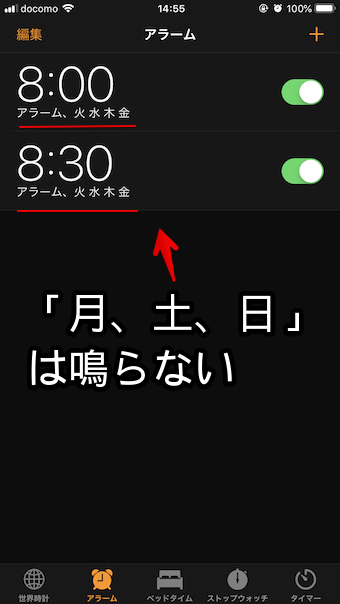 例如,即使您打算将闹钟设置为在工作日启用,但有时星期指定不正确,如下所示。