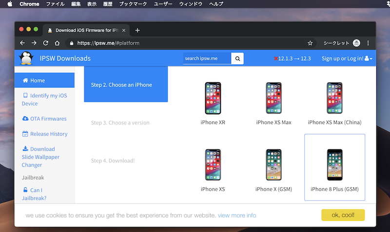 iOS固件下载页面从那里,选择“目标设备”和“要降级的旧版 iOS 固件”并下载。