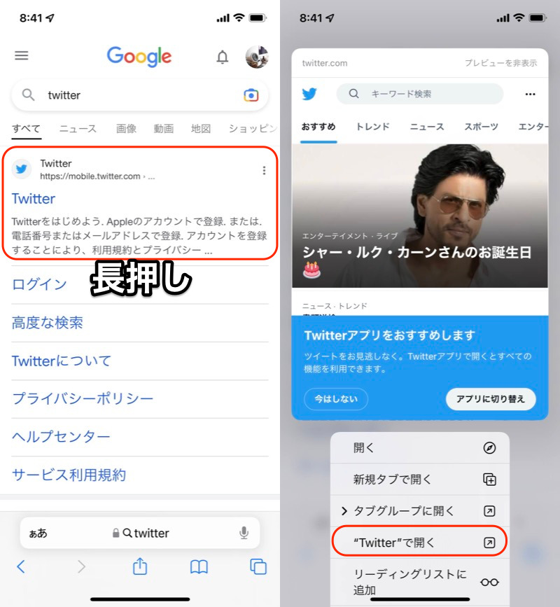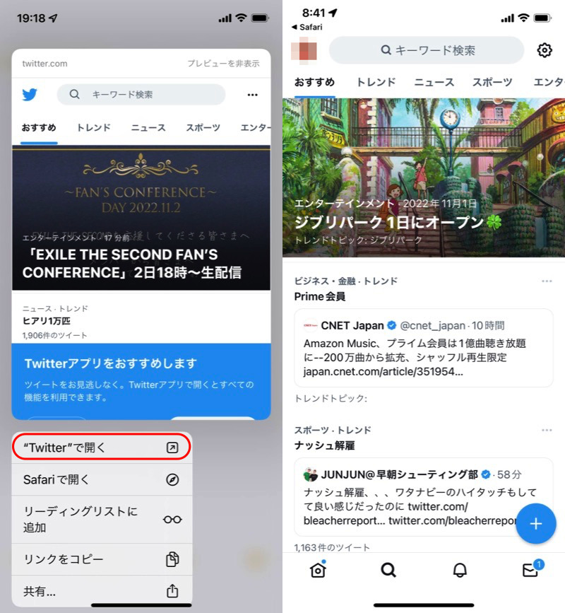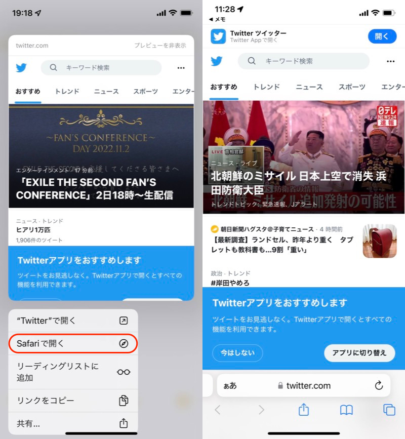 选择“使用 Twitter 打开”并启动 Twitter 应用程序的示例。