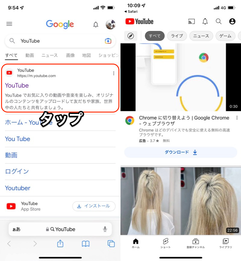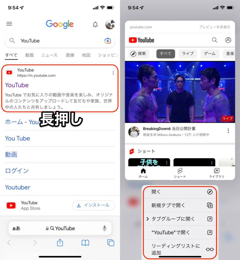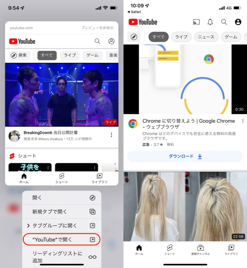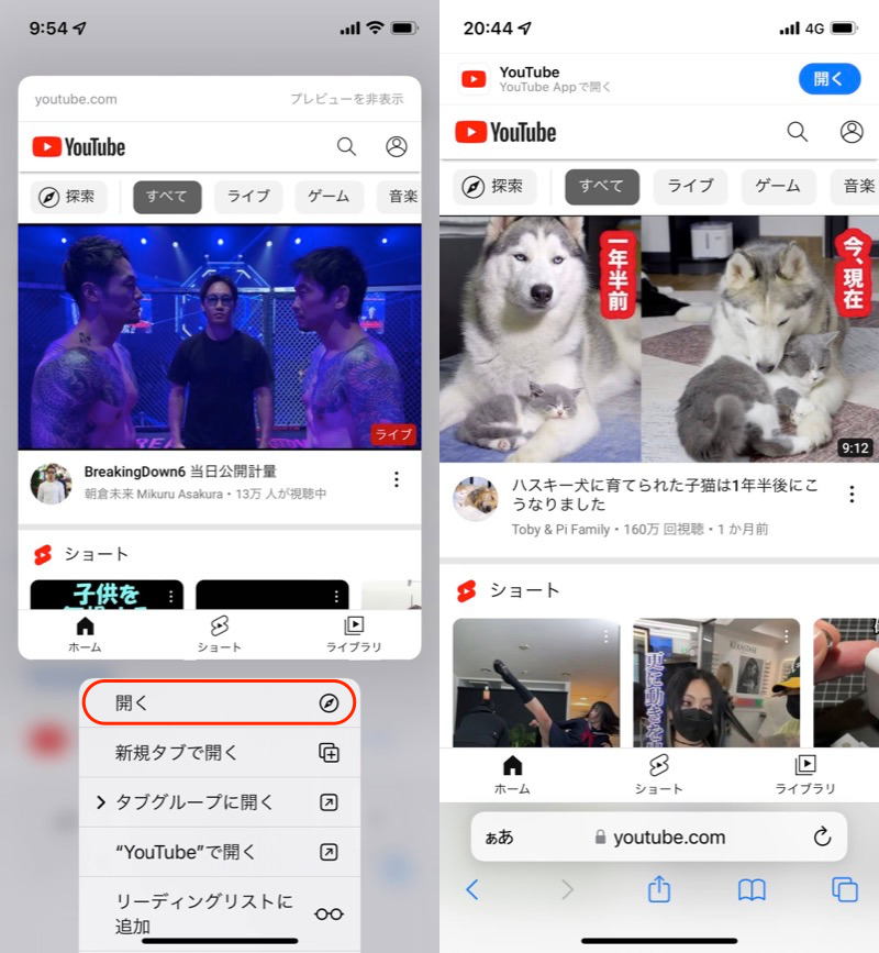 选择“通过 YouTube 打开”并启动 YouTube 应用程序的示例。