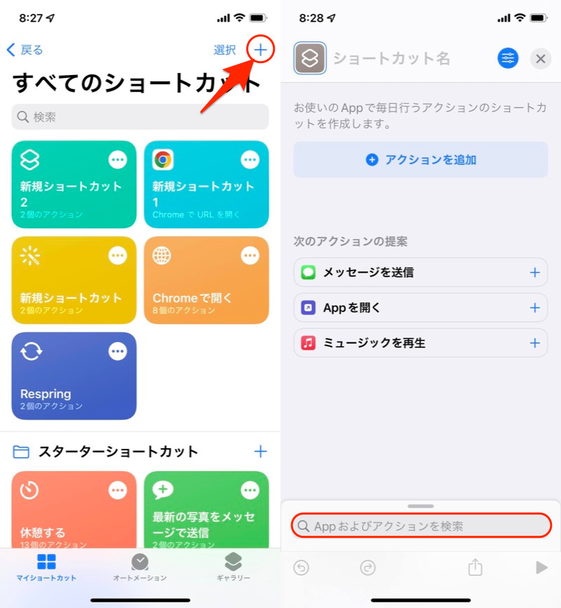 通过顶部屏幕上的 + 图标添加新的快捷方式。