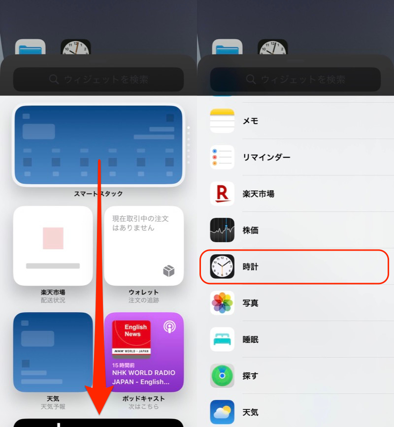 按住主屏幕上的空白区域,从 + 图标打开小部件,然后选择时钟应用程序。