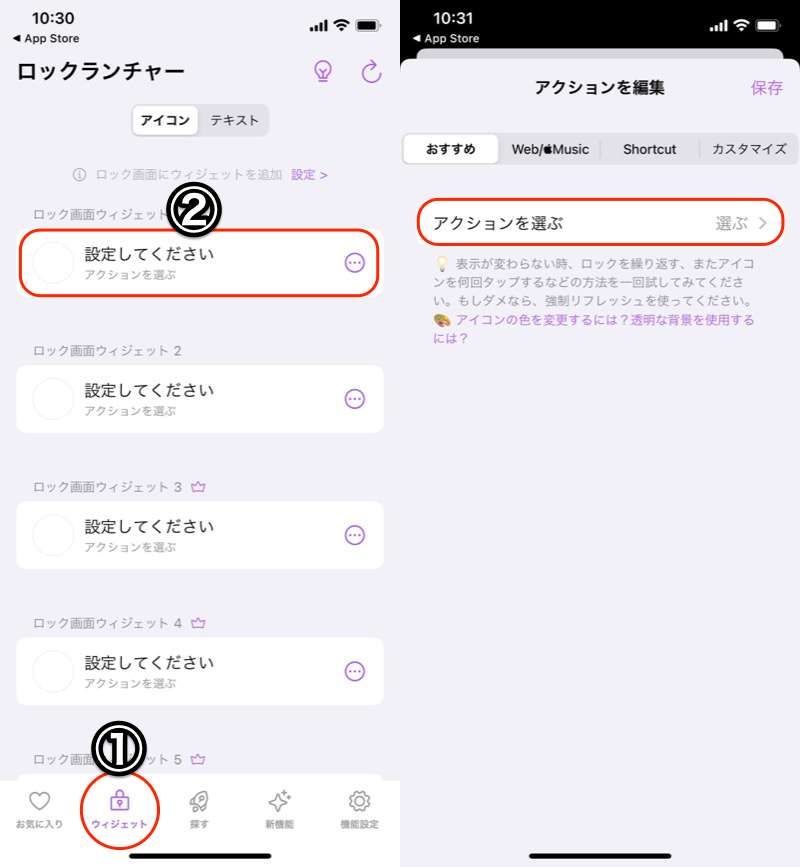 (左)① 小部件 → ② 创建新小部件 (右)选择操作