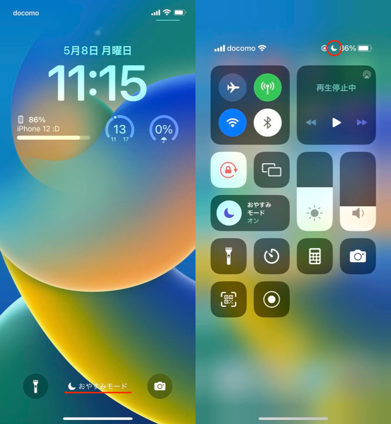 点击控制中心中的红框(左)并点击“请勿打扰”将其关闭(右)的示例。