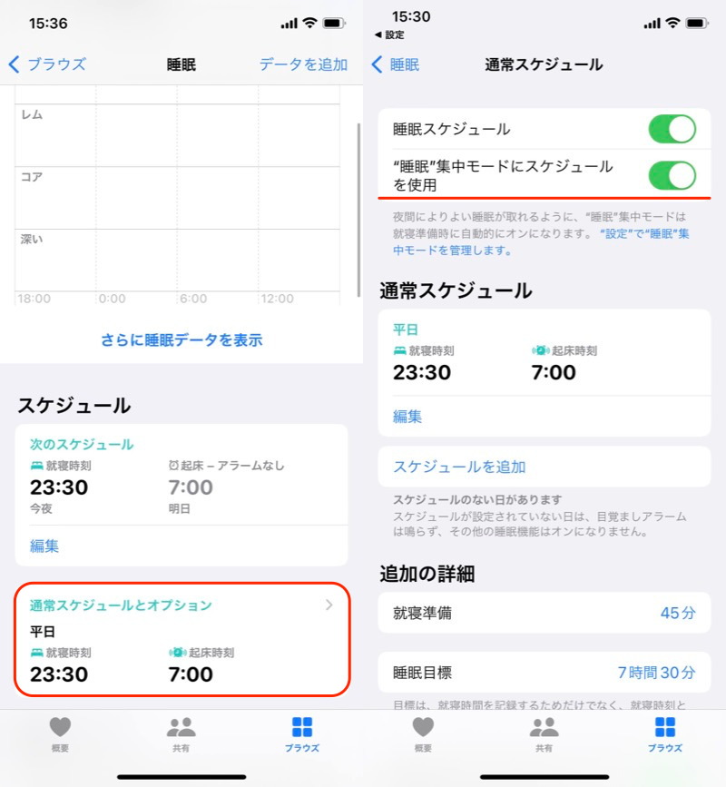 (左)浏览→睡眠→正常时间表和选项(右)确保红色下划线未亮起。