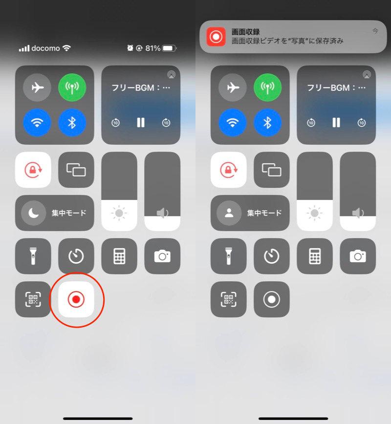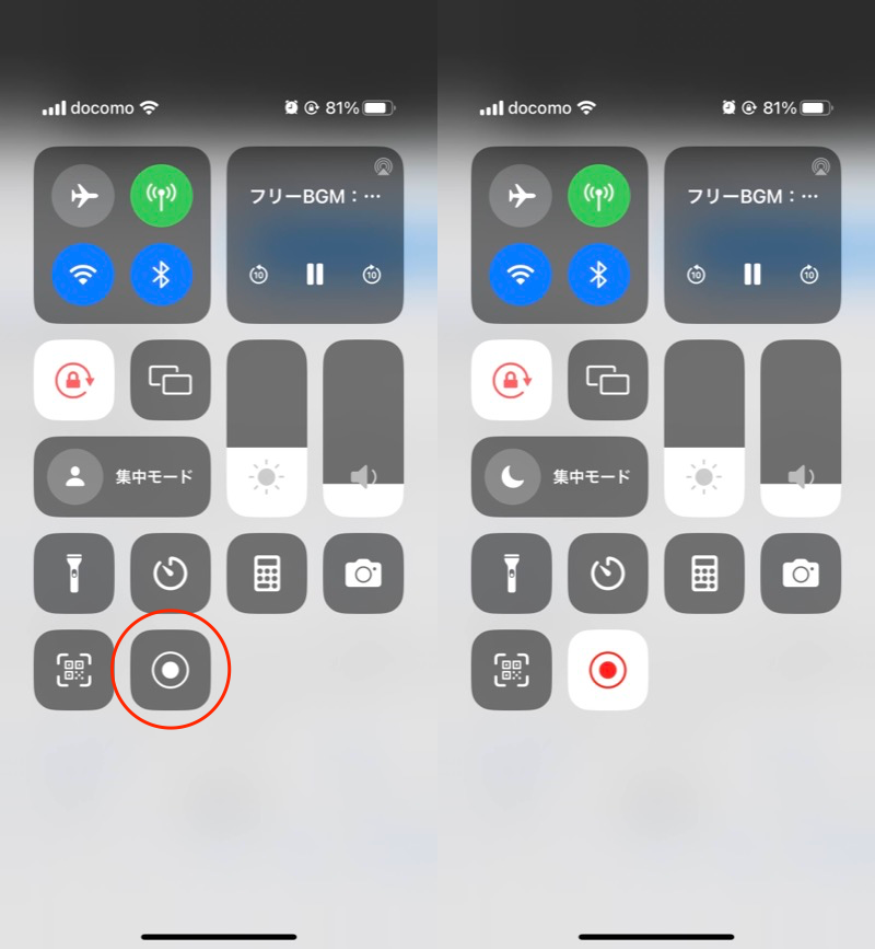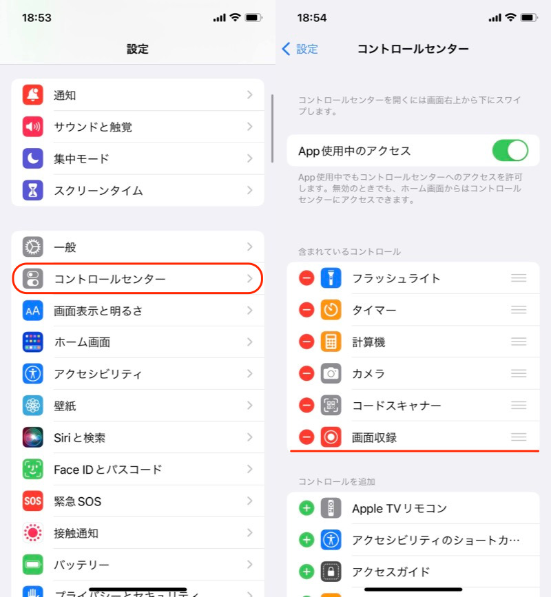 (左)打开设置应用程序的控制中心(右)如果已添加屏幕录制则OK