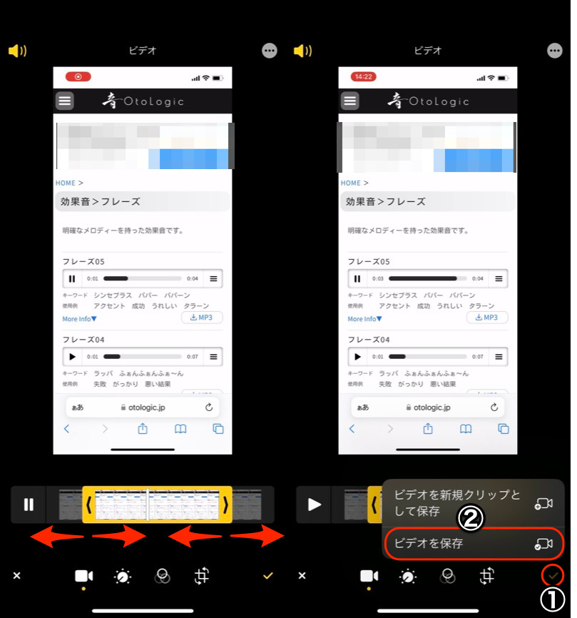 (左) 指定范围 (右) ① ✓ 检查按钮 → ② 保存视频