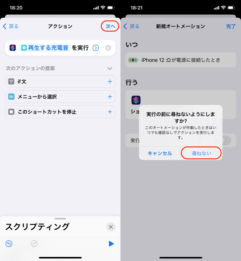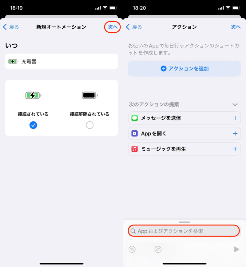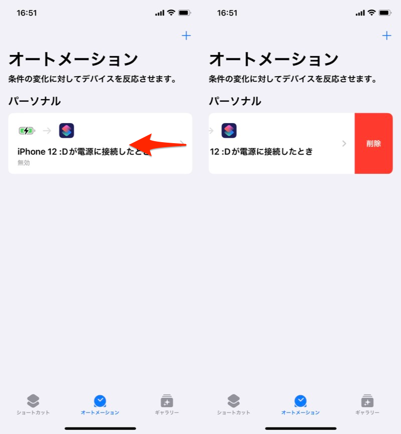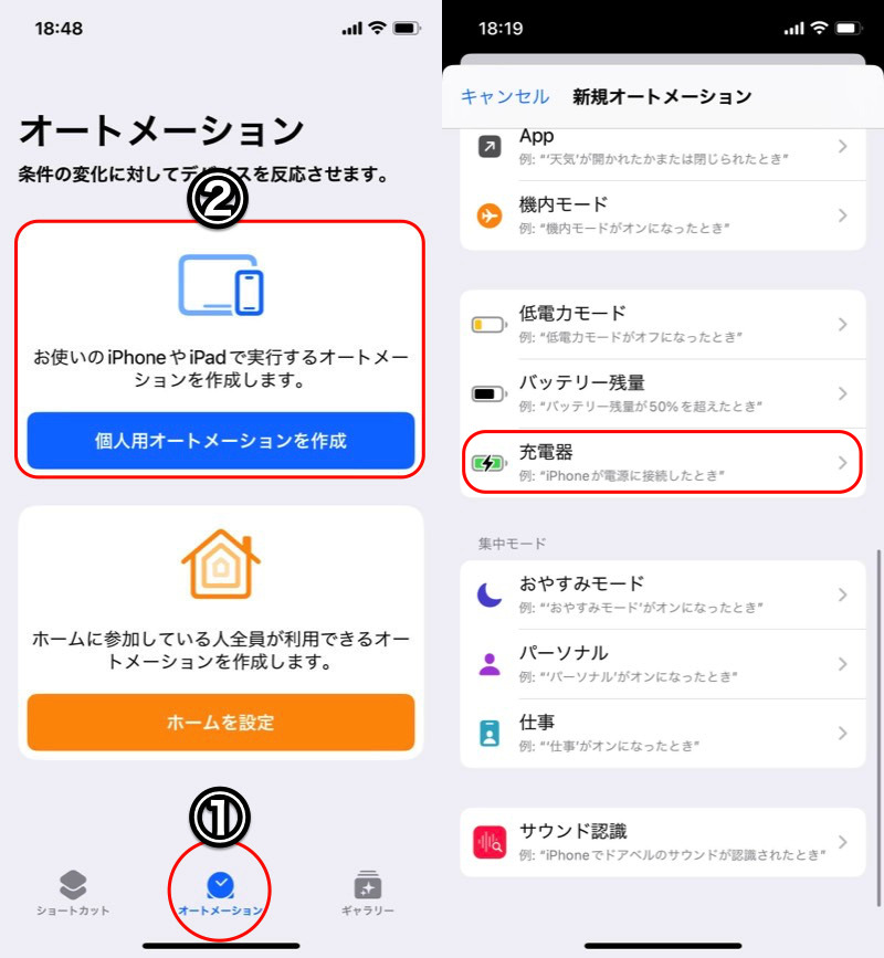(左)①自动化 → ②创建个人自动化(右)充电器
