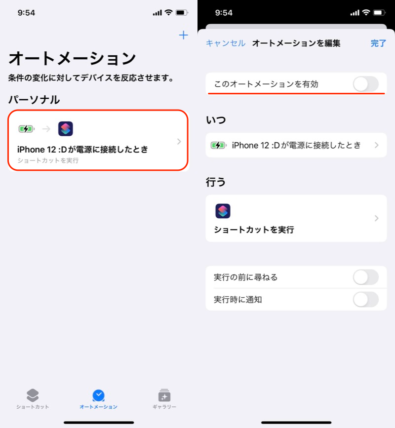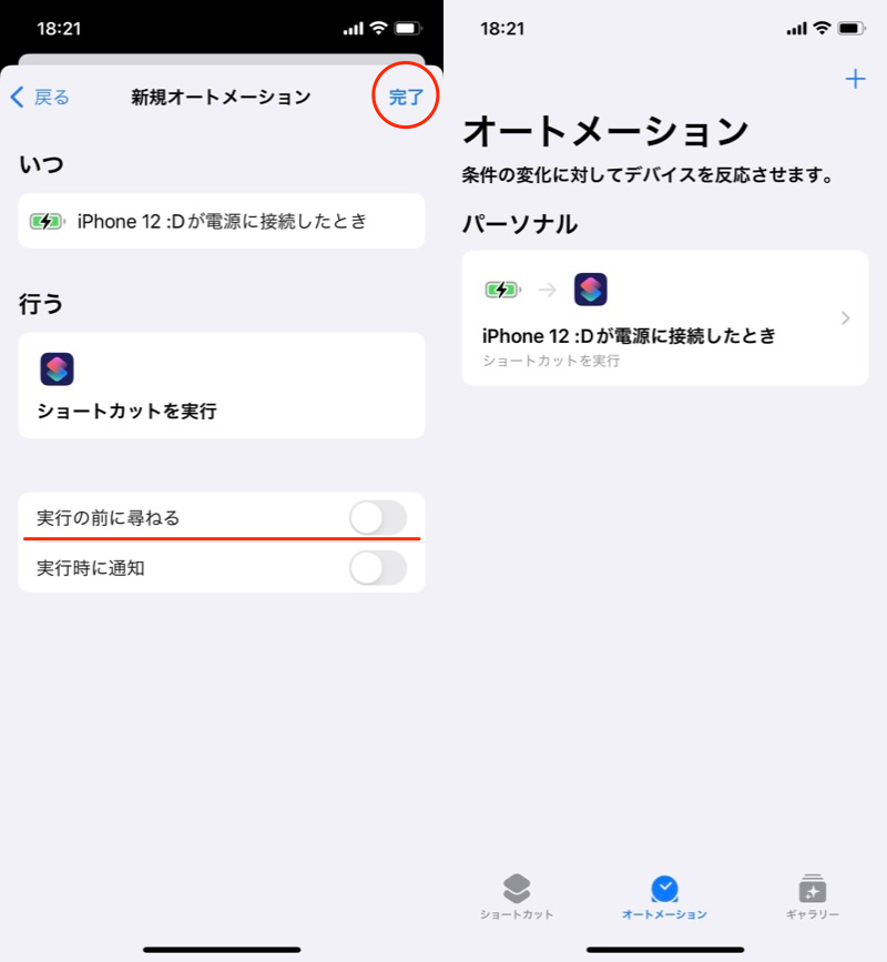 (左)已完成,执行前询问已关闭(右)出现在自动化列表中