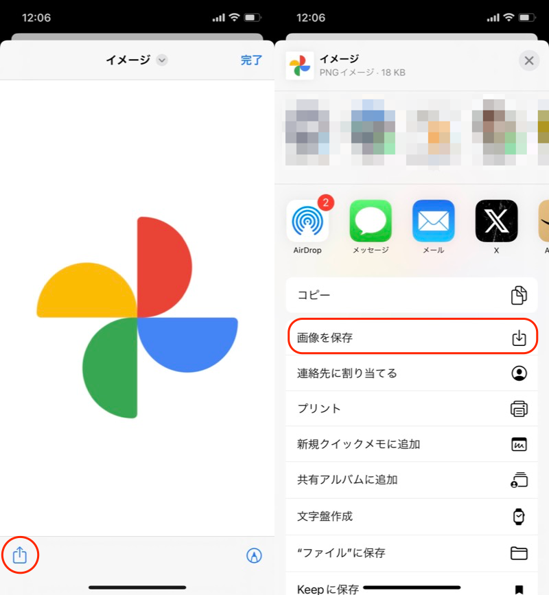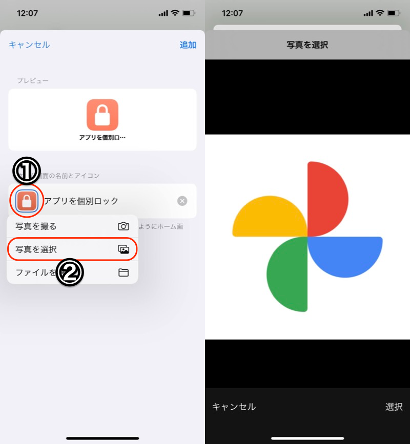 (左) ① 点击红框 → ② 选择照片 (右) 选择图标图像