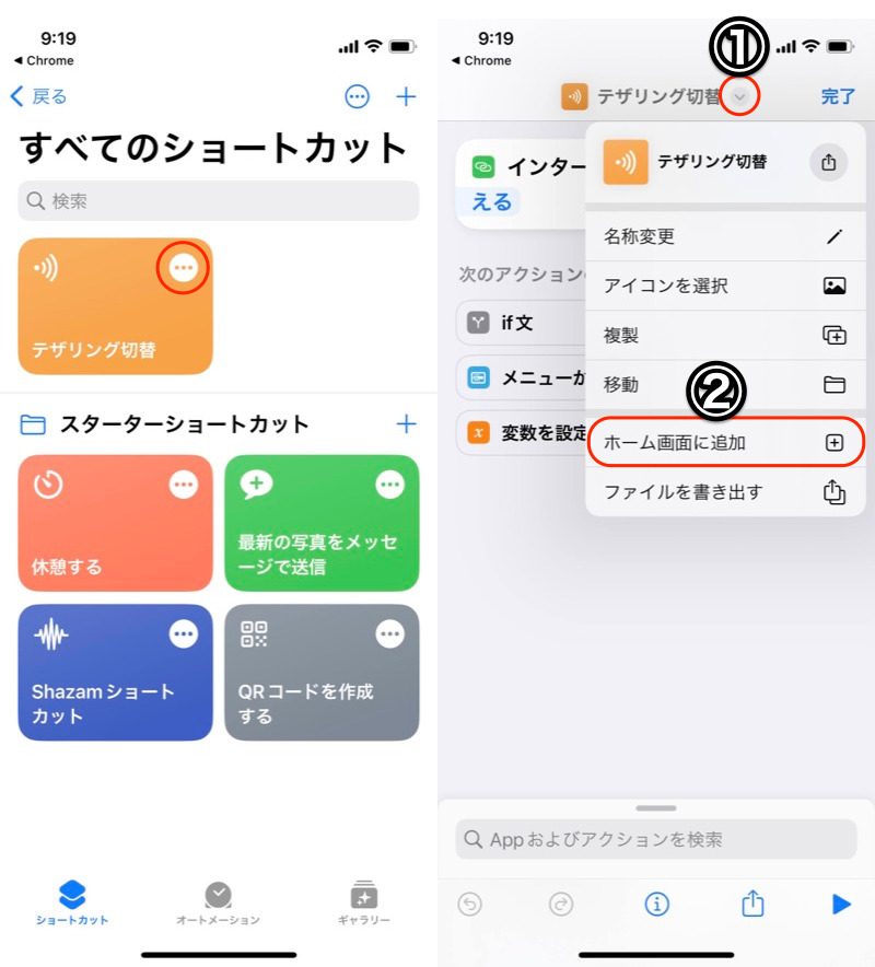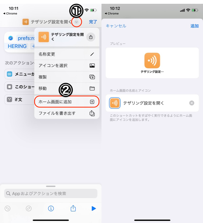 (左)① 向下箭头图标 → ② 添加到主屏幕 (右)添加快捷方式