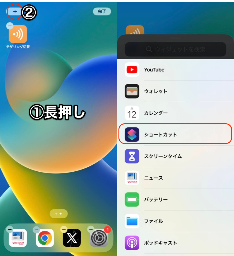 (左)① 长按空白处 → ② + 图标 (右)快捷方式
