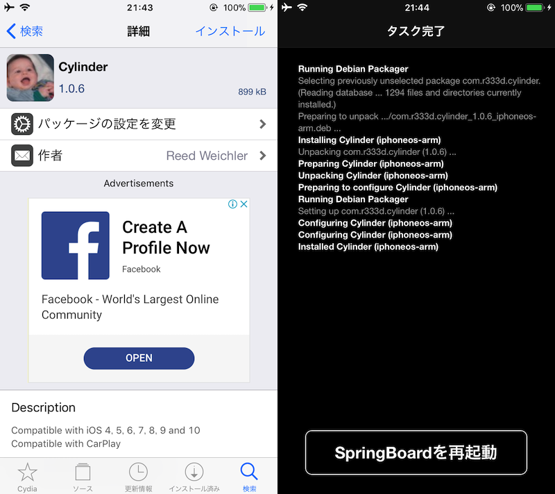 搜索“Cylinder”并执行“安装”和“重新启动SpringBoard”。