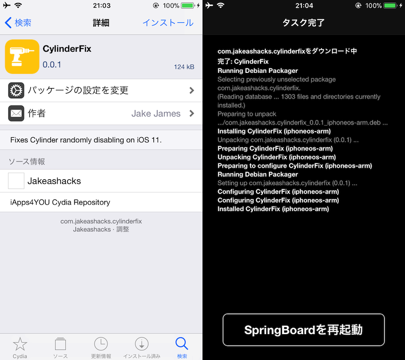 接下来,搜索“CylinderFix”并执行“安装”和“重新启动SpringBoard”。