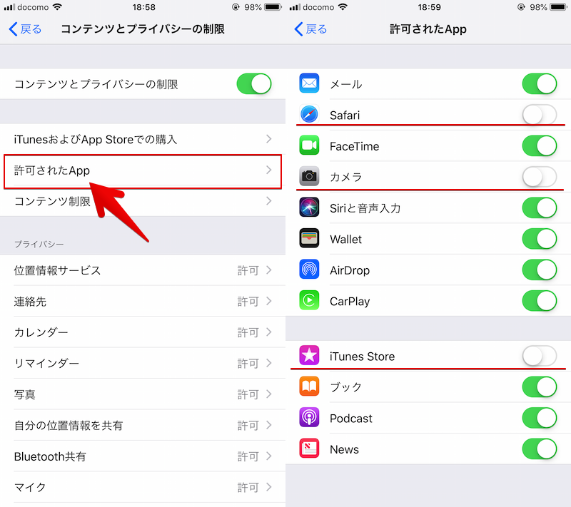 在“屏幕时间”设置中禁止“Safari”、“相机”和“iTunes Store”的示例。