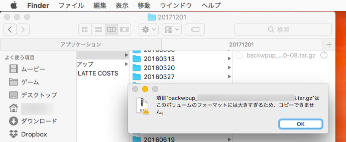 这可能是外部存储介质的文件系统导致的;例如,带有“MS-DOS (FAT32)”的外部 HDD 每个文件的最大限制为 4GB,因此您无法从 Mac 移动文件。