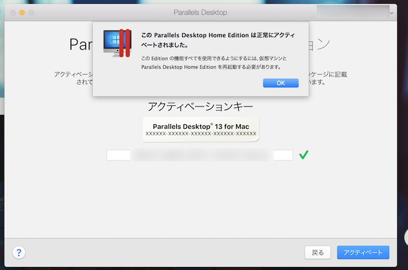 このParallels Desktopは正常にアクティベートされました。 このEditionの機能すべてを使用できるようにするには、仮想マシンとParallels Desktopを再起動する必要があります。