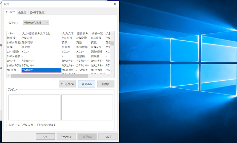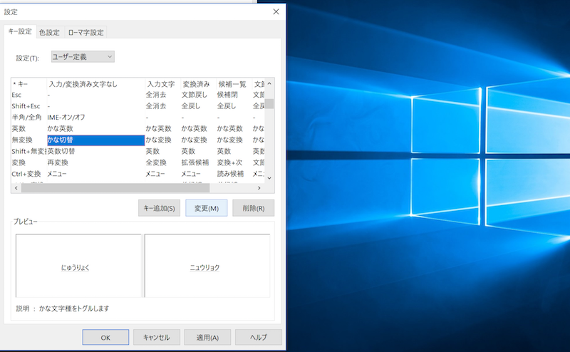 在同一流程中,“*key”列无转换找到“无输入/转换字符”列假名切换与选定的改变继续进行