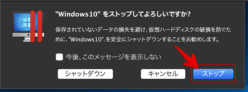 "Windows10" をストップしてよろしいですか? 保存されていないデータの損失を避け、仮想ハードディスクの破損を防ぐために、"Windows10".を安全にシャットダウンすることをお勧めします。