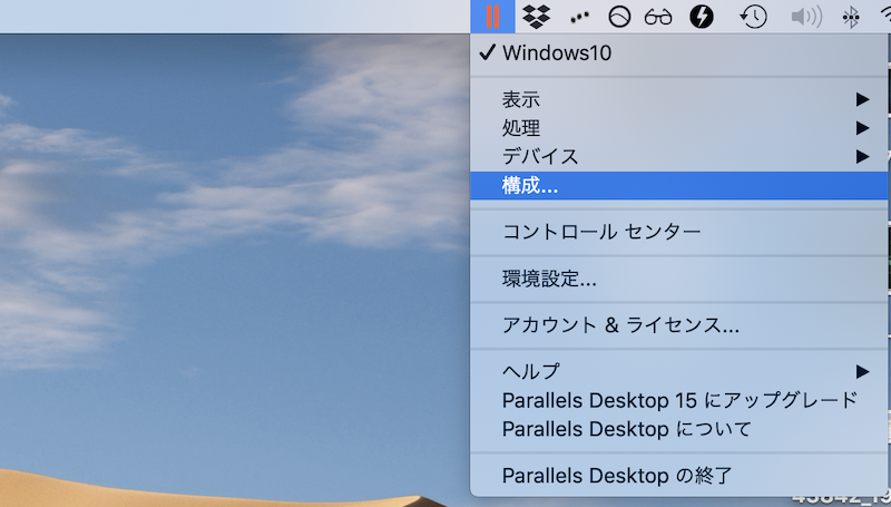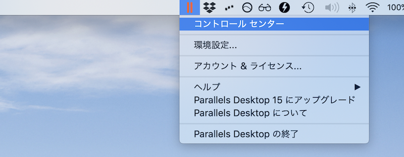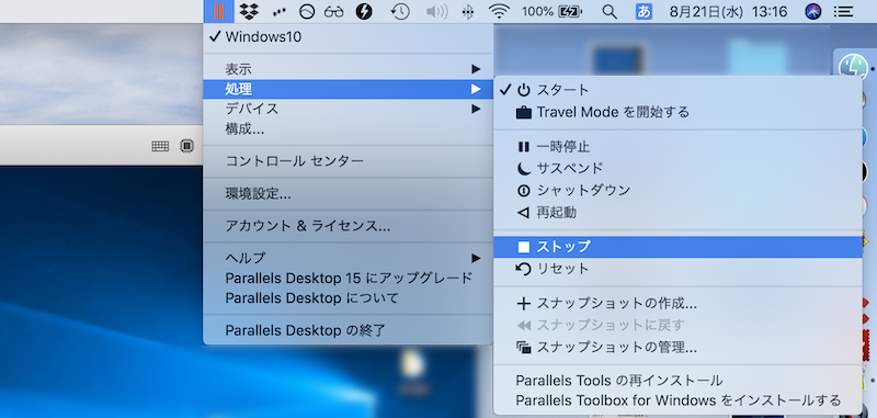 从菜单栏中的 Parallels Desktop 图标执行停止的示例。