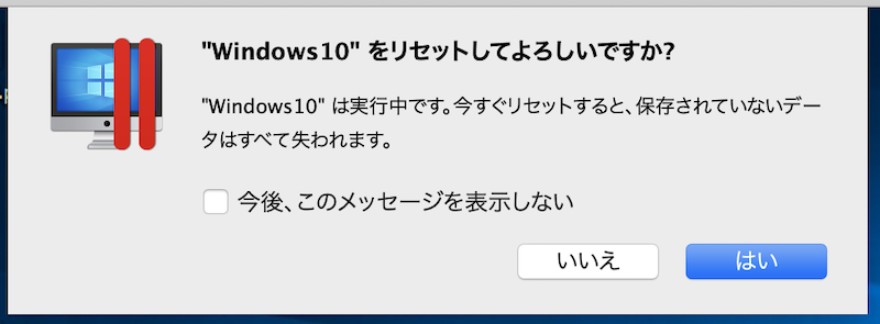 "Windows10" をリセットしてよろしいですか? "Windows10" は実行中です。今すぐリセットすると、保存されていないデータはすべて失われます。