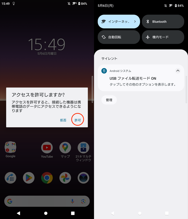 以 Xperia 10 II 为例。通过 USB 连接时,将出现一条请求访问权限的消息。