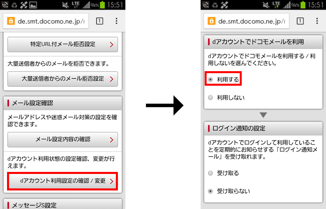 然后,您可以选择是否通过您的 d 帐户使用 Docomo Mail,因此请选中“使用”。