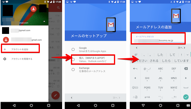 对于电子邮件类型,输入个人(IMAP 或 POP),对于电子邮件地址,输入您要确认的 docomo 电子邮件地址。