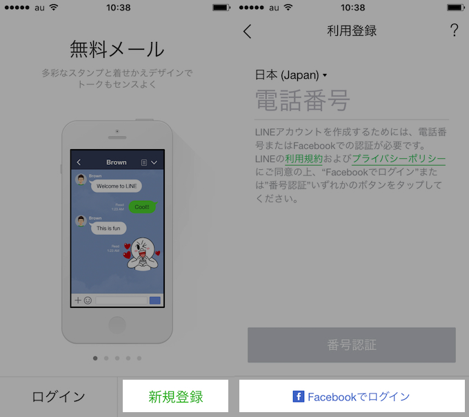启动 LINE 并继续“新注册”→“使用 Facebook 登录”。