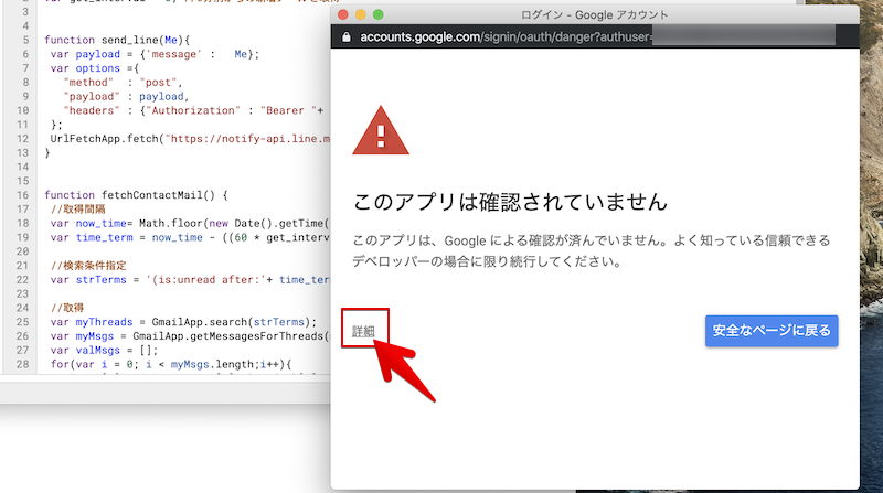 このアプリは確認されていません このアプリは、Googleによる確認が済んでいません。 よく知っている信頼できるデベロッパーの場合に限り続行してください。