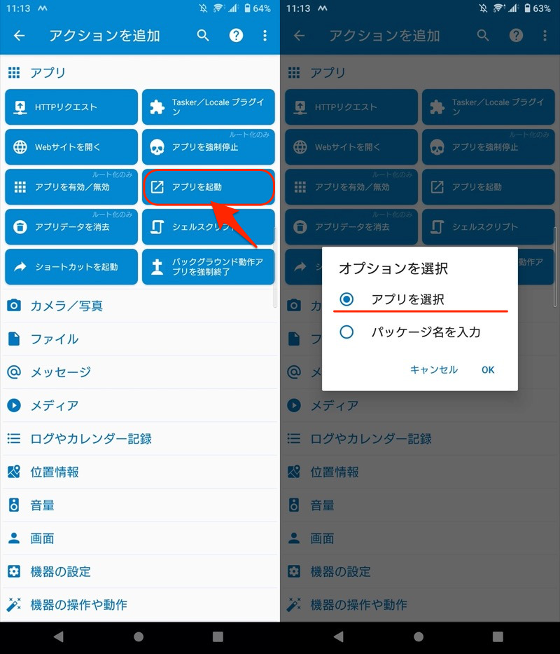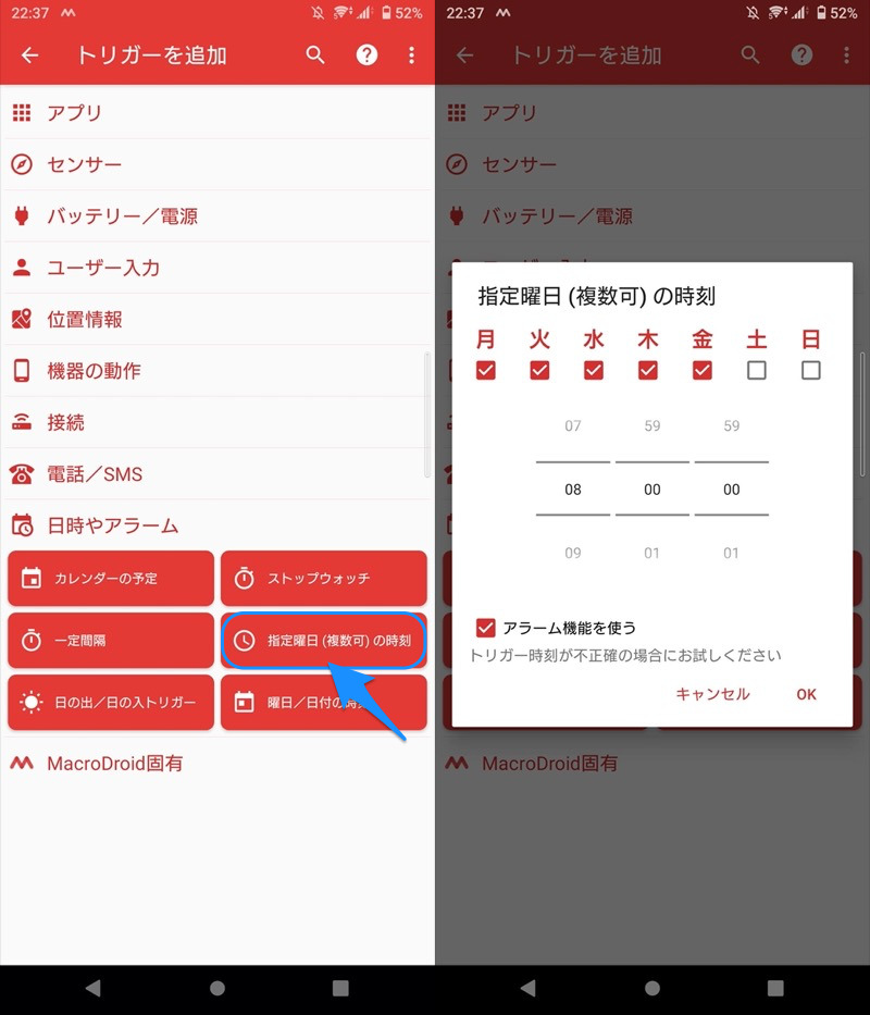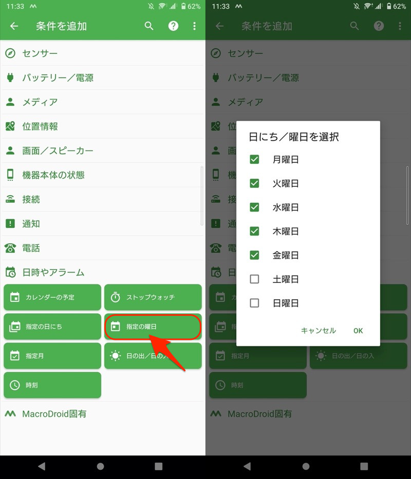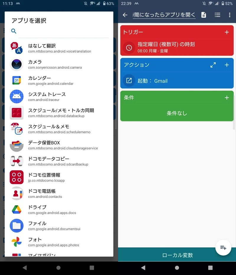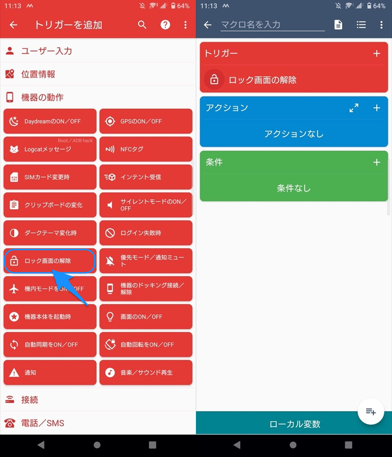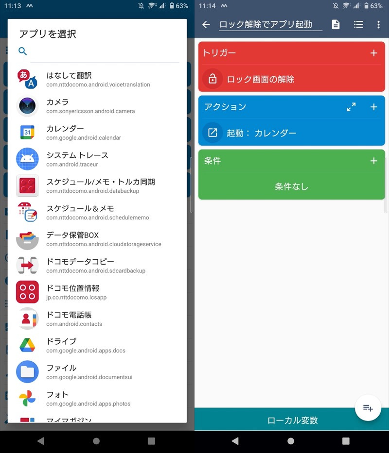 (左)应用程序列表(右)解锁时启动日历应用程序的宏示例