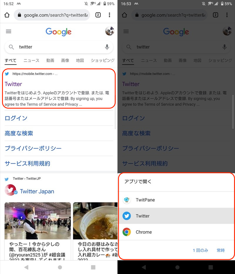 例如,当您点击 Twitter 链接(左)时,您始终可以指定在哪个应用程序中打开它(右)。