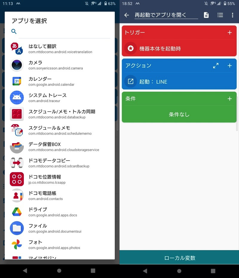 (左)应用程序列表(右)通过重新启动来启动 LINE 应用程序的宏示例