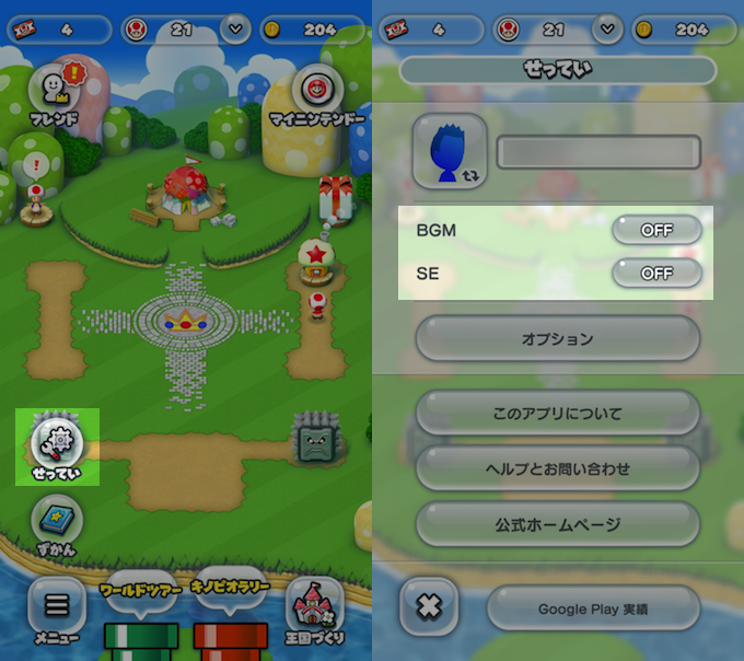 「超级马里奥酷跑”应用程序具有与iOS和Android版本通用的BGM和音效相关的设置。