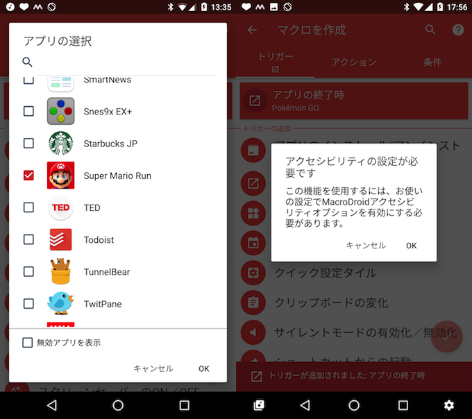 将出现 Android 上安装的应用程序列表,因此选中“Super Mario Run”并继续下一步。此时,如果您尚未启用 MacroDroid 的辅助功能设置,则需要启用该设置。