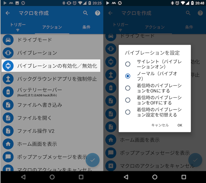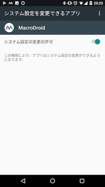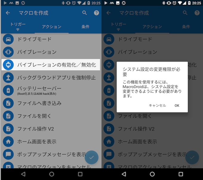 首先,从行动候选名单来看,启用/禁用振动”并允许“MacroDroid”应用程序更改系统设置(仅限第一次设置)。