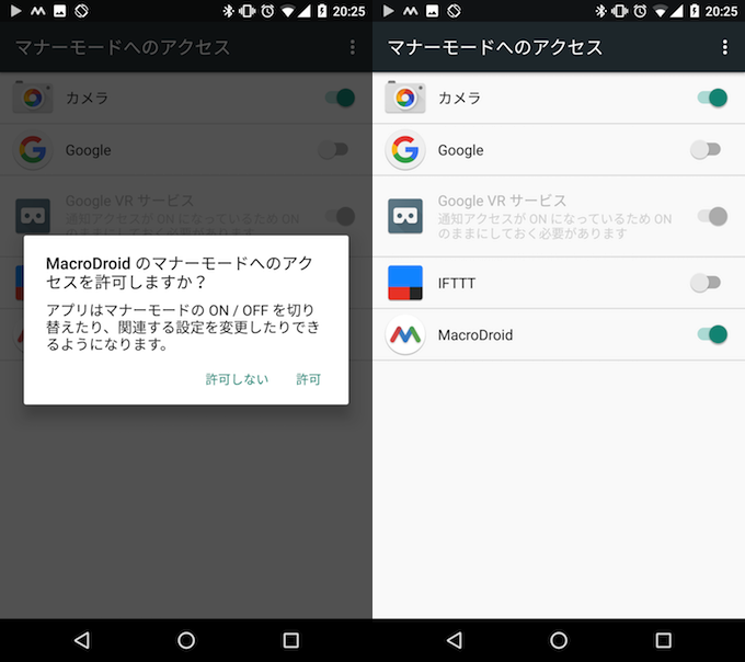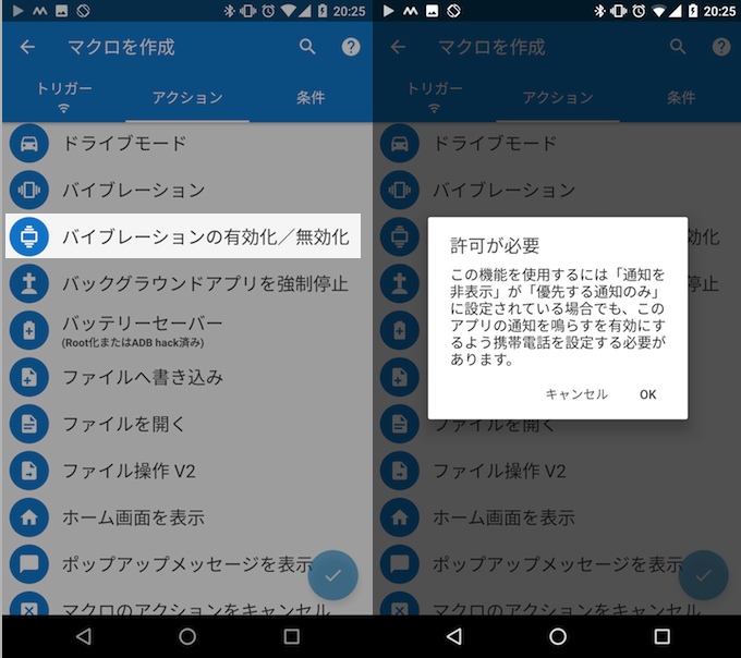 如果您再次选择“启用/禁用振动”,“MacroDroid”应用程序将请求访问静音模式的权限(仅在第一次时设置)。