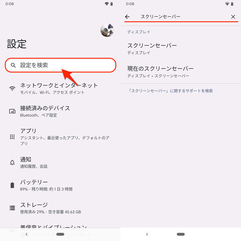 在 Pixel 3a XL 的设置屏幕上搜索的示例。