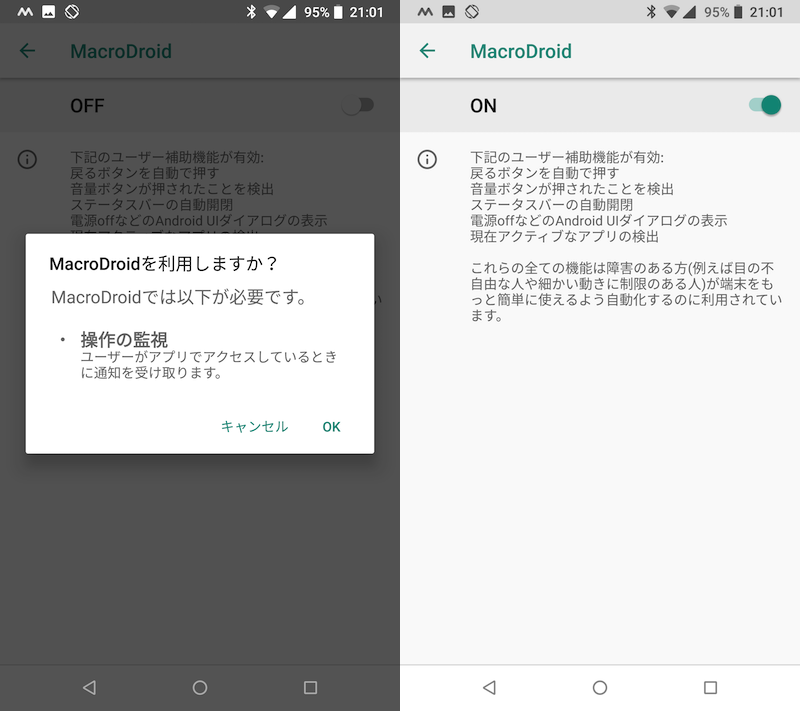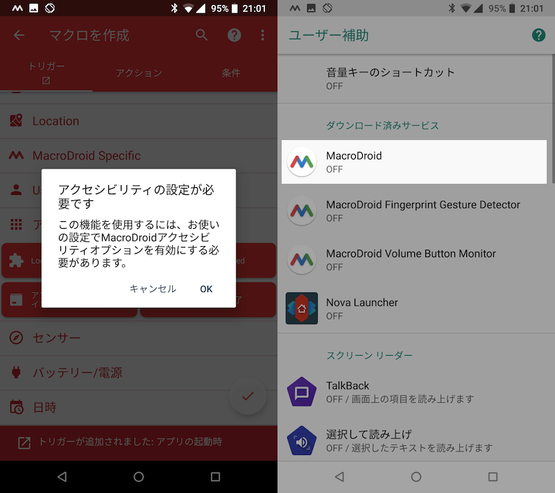 此时,仅第一次需要“辅助功能设置”,因此请按照屏幕上的说明进行操作,并在“辅助功能”设置中选择 MacroDroid。
