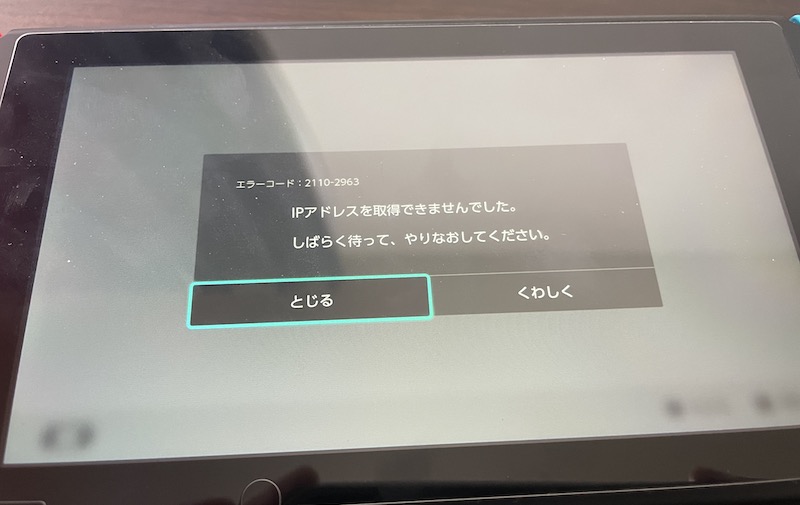 エラーコード:2110-2963 IPアドレスを取得できませんでした。 しばらく待って、やりなおしてください。