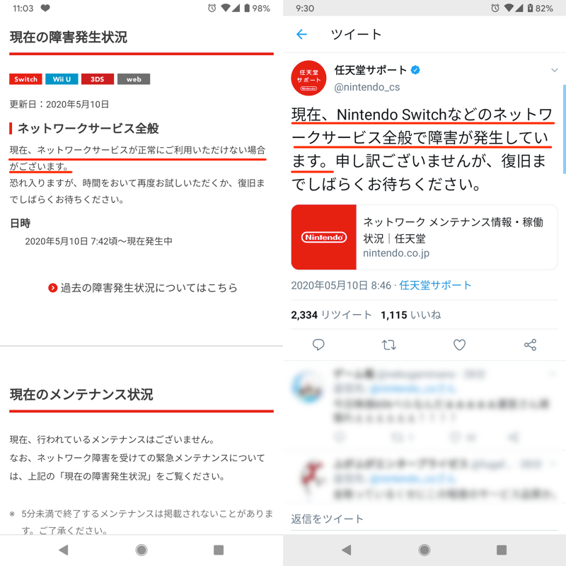 实际发生故障时在官方网站(左)和 Twitter(右)上发布公告的示例。