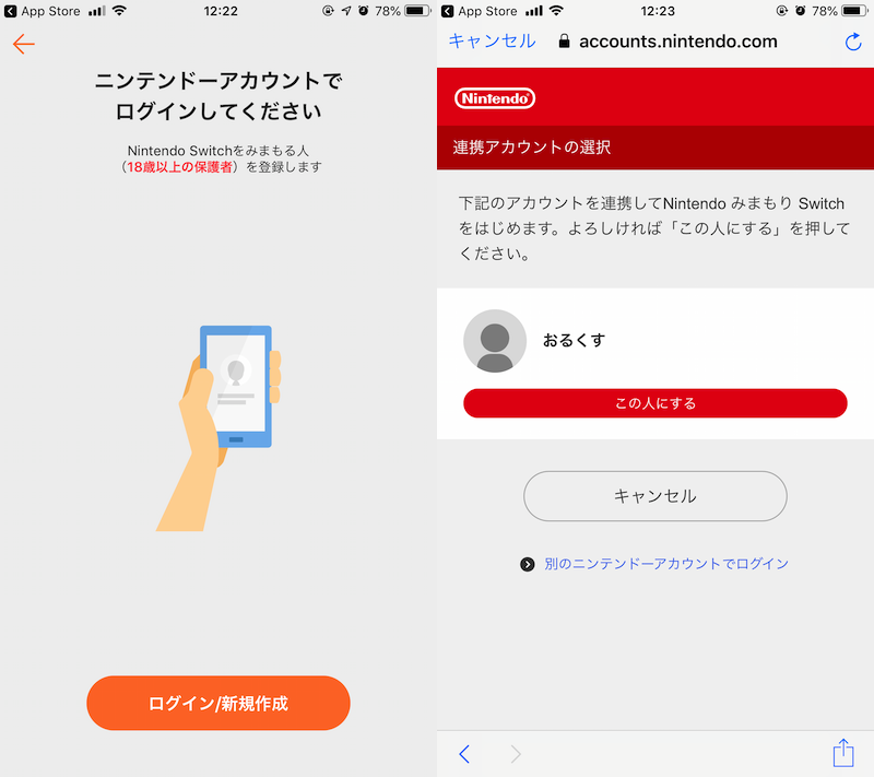 首先,在智能手机上打开“Mimamori Switch”并登录您的任天堂帐户。