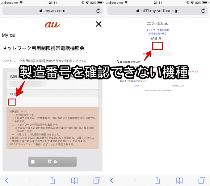 另一方面,au和软银的“网络使用限制”确认网站显示“-”结果,这证实了它是Docomo版本的iPhone。