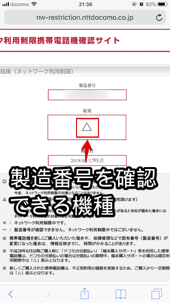 例如,如果您使用 Docomo 版 iPhone 的序列号(IMEI)搜索各个网站,则可以通过在 Docomo 的“网络使用限制确认网站”上检查“△”的结果来确认它是 Docomo 版 iPhone。