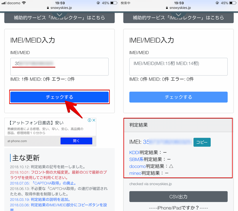 接下来,输入各公司“网络使用限制”确认网站的序列号(IMEI)并显示结果。