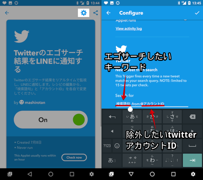 详细内容请参见相关文章【如何链接 IFTTT 和 LINE 以通知 twitter 的 ego 搜索结果自动化 [iPhone/Android]] 进行了解释。