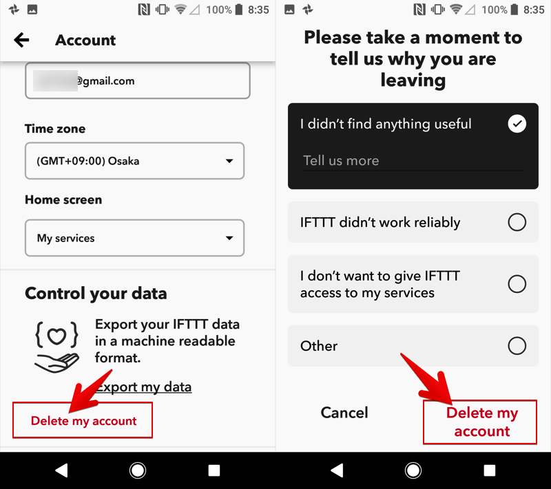如果您想取消 IFTTT,请转至帐户菜单。删除我的帐户如果你选择了就OK了。