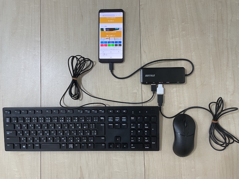 通过集线器布置智能手机、有线鼠标和有线键盘的示例。